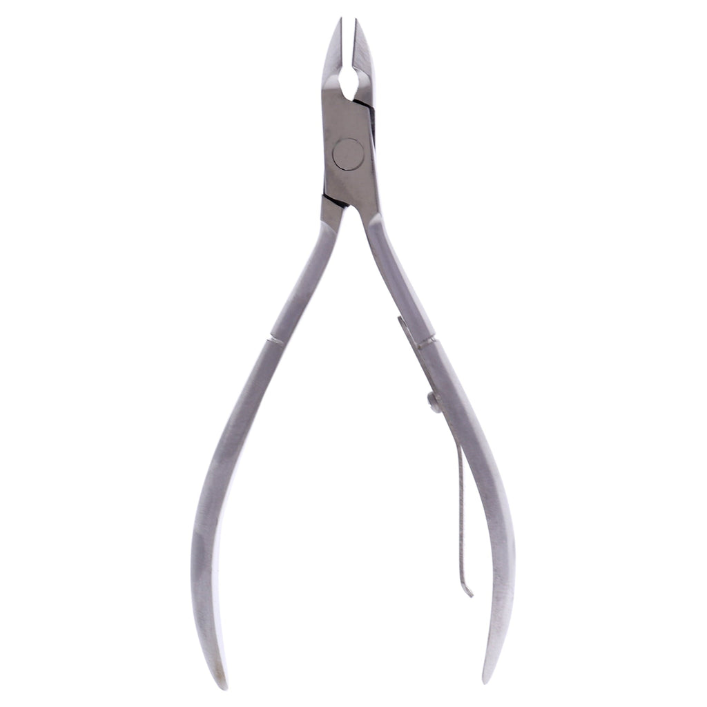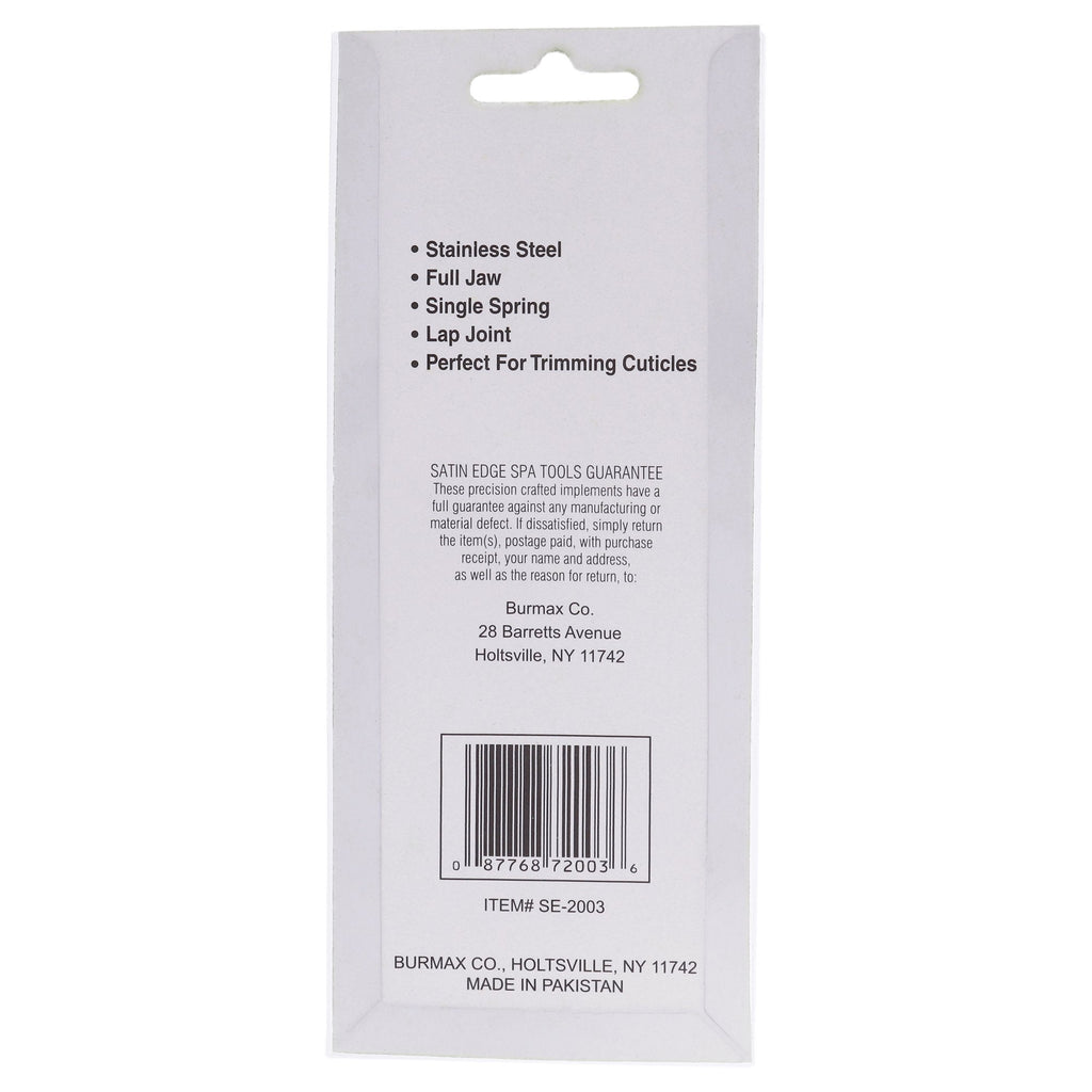 Features a stainless steel satin finish, half jaw, Single spring, box joint. It is perfect for trimming cuticles. It has a removable, comfortable grip handle and comes in three assorted colors - black, blue and purple