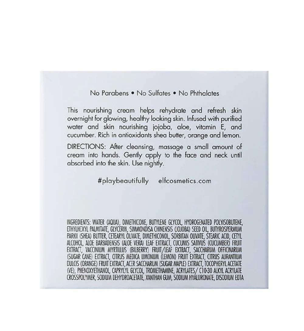 This nourishing cream helps rehydrate and refresh skin overnight for glowing, healthy looking skin. Infused with Purified Water and skin nourishing Jojoba, Aloe, Vitamin E, and Cucumber to help soothe and protect the skin. Rich in antioxidants Shea Butter, Orange and Lemon.