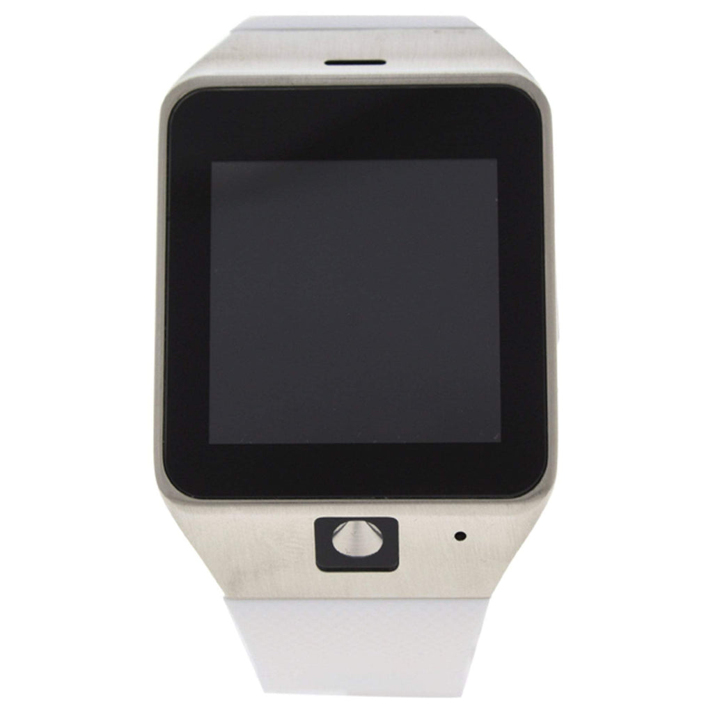 Ek-d2 montre connectee rectangular silver connected watch on a white silicone strap. Dial with digital display, with barometer and altimeter functions. The music function and more.