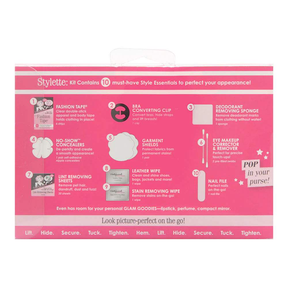 Secret No. 31: Lift. Hide. Secure. Tuck. Tighten. Hem. Each Purse-Perfect Kit Contains 10 Style Essentials to Prevent Beauty Blunders and Wardrobe Malfunctions! Look buttoned-up and feel confident on-the-go! Contains solutions for the most common everyday malfunctions. The compact pouch is perfectly portable and great to pop in your purse. Adorable designs appeal to every fashionista. Little bag. Big value.