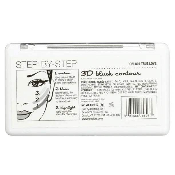 Contour, highlight and blush in 3 easy steps with the 3D Blush Contour palette. Velvety, color coordinated powders make contouring and adding dimensional color to cheeks a breeze! Colors range from matte, frosted and shimmery for a variety of sculpted looks. Palette includes step-by-step illustration and detailed pressing on powders for convenient application.