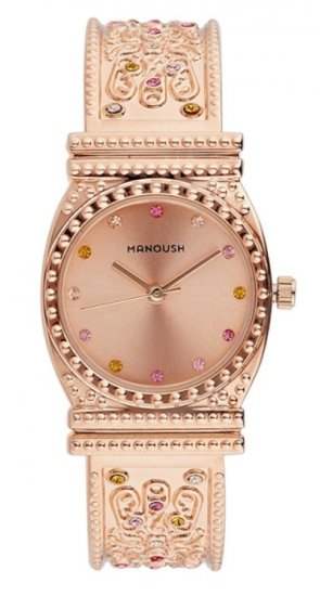 Gold-tone stainless steel case with a stainless steel bracelet. Gold dial with gold-tone hands and diamond hour markers. Round case shape. Dial type is analog. Women style watch by Manoush.